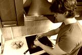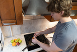 Cracking egg into hot pan caucasian young man cooking homemade breakfast in small kitchen doing simple morning routine preparing food. Healthy Breakfast. Home Kitchen Lifestyle