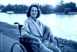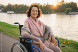 Happy senior woman in wheelchair smiling enjoying freedom walking on road in city park outdoor. Old cheerful positive woman in chair for people with disability. Disability disease rehabilitation