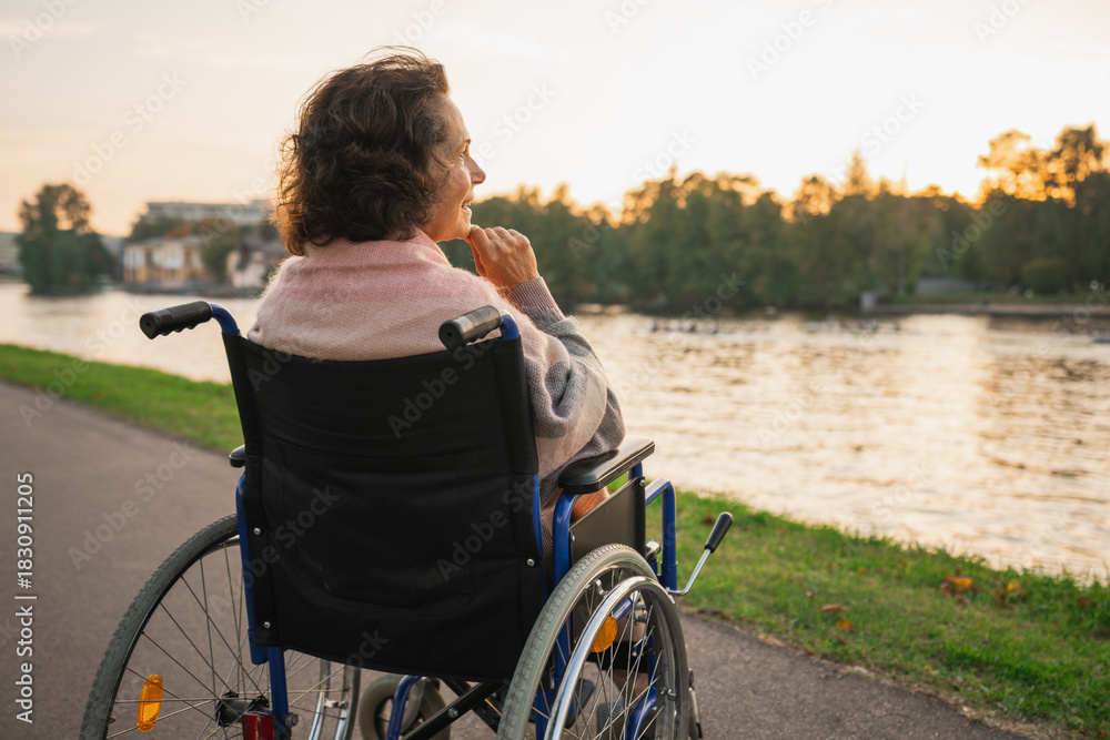 Sad senior woman sitting in wheelchair walking on road in city outdoor, back view. Old paralyzed lady in chair for people with disability feel depressed. Lonely elderly sick woman sits on wheelchair