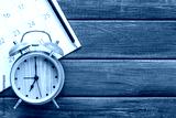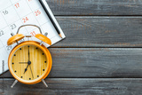 Alarm clock is on calendar with pencil, top view. Planning and time management concept
