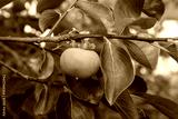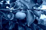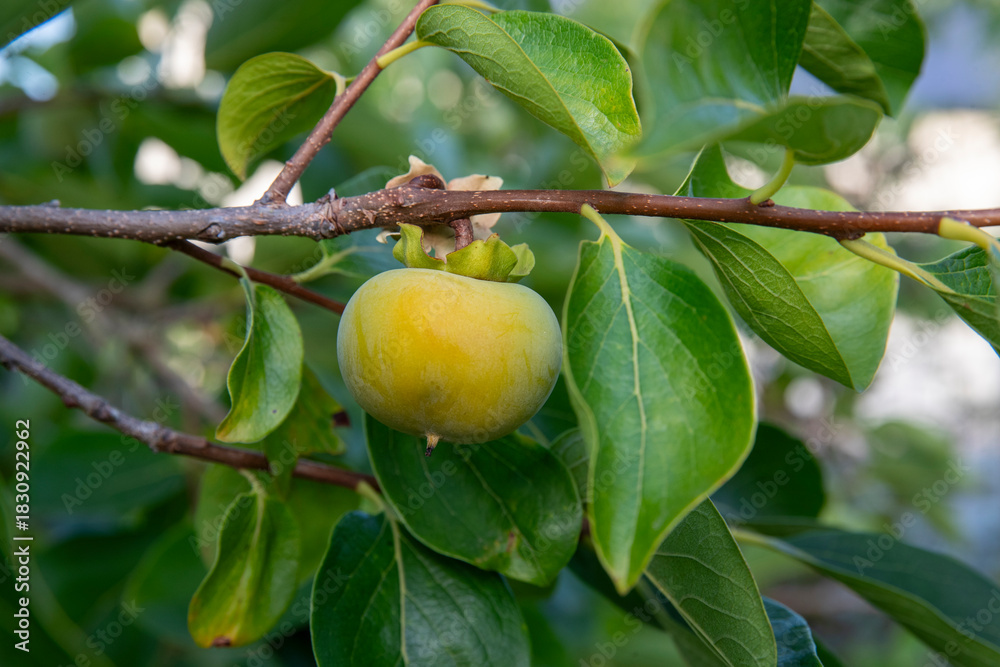 Branche d'arbre avec des petits kakis encore verts et des feuilles. Lumière douce et ensoleillée d'une fin de journée en été.