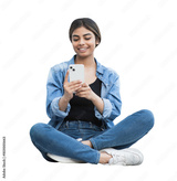 Young woman sitting and using mobile phone isolated transparent PNG, Smiling student girl looking at smartphone and texting over white cut-out background.