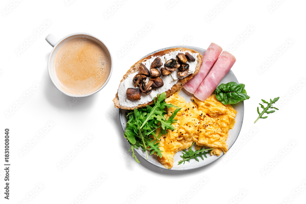Healthy balanced breakfast with scrambled eggs, sandwich, ham