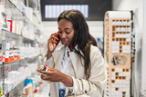Black woman talking on phone while reading product label, shopping for medicine and health supplements in a pharmacy