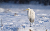 Great egret stands in the snow, Ardea alba, winter in Europe