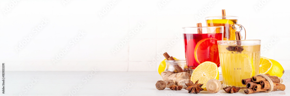 Three different Hot Toddy drinks in different tea cups - hot autumn winter tea cocktail beverages with scotch, rum and mezcal alcohol drinks, spices, lemon and honey