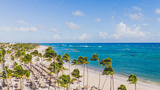 Vista aeres de la playa de isla tropical con palmeras y mar caribe, punta cana, república dominicana