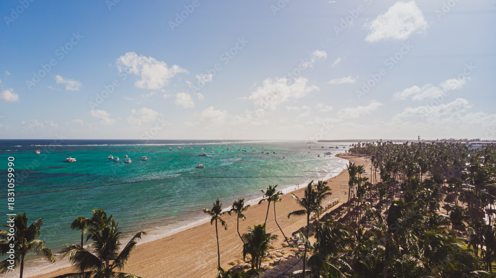 Vista aeres de la playa de isla tropical con palmeras y mar caribe, punta cana, república dominicana
