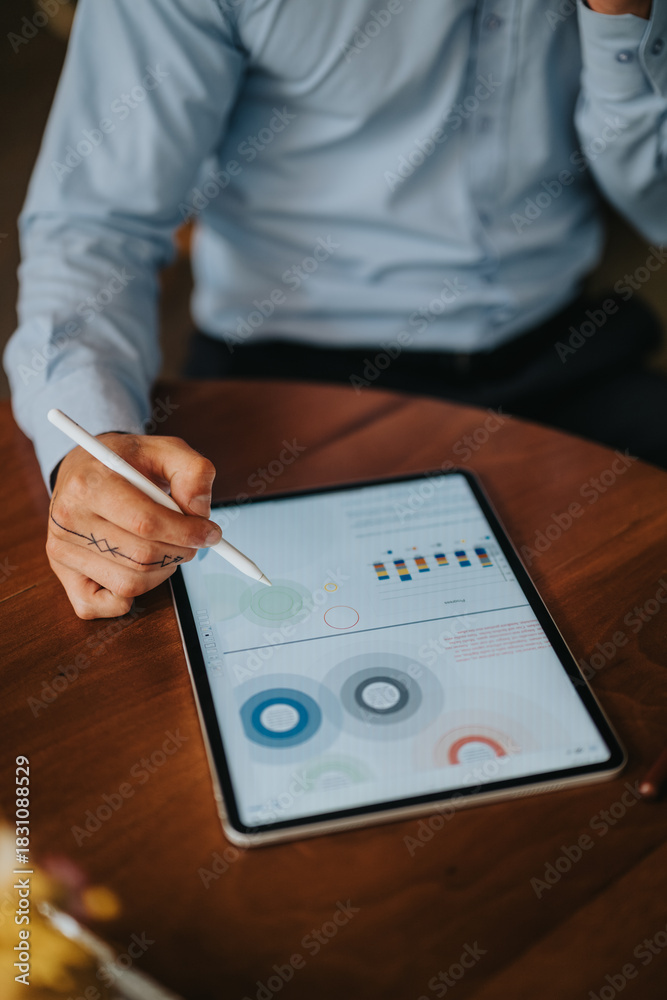 A hands-on view of a person in a light shirt working on a tablet, exploring charts and circular data visuals for business analytics.