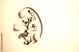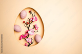 Top view pastel beige background with Easter decor, delightful flowers and easter eggs in an egg frame with copy space. Festive pastel background for your text.