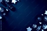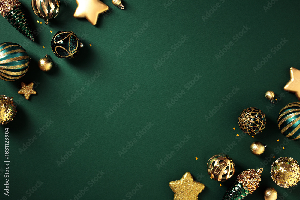 Dark green background with elegant gold and green Christmas ornaments and stars. Flat lay, top view