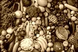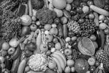 Vegetables and fruits large overhead assorted mix group on colorful background in studio