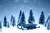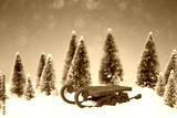 Festive holiday scene, Idyllic winter landscape displaying sled full of gifts surrounded by pine trees