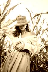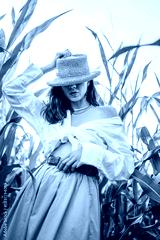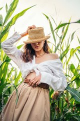 Attractive Long Haired Female Straw Hat Fashion Photoshoot Corn Field Crop Top White Blouse Brown Belt Skirt Standing Among Green Corn Stalks Sunny Summer Style Portrait Beautiful Woman Posing Outdoor
