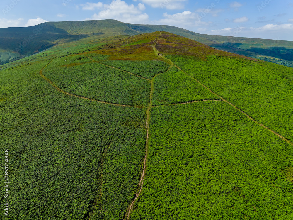 Aerial view of the lush green hills and hiking trails of Carn Pica, Brecon Beacons