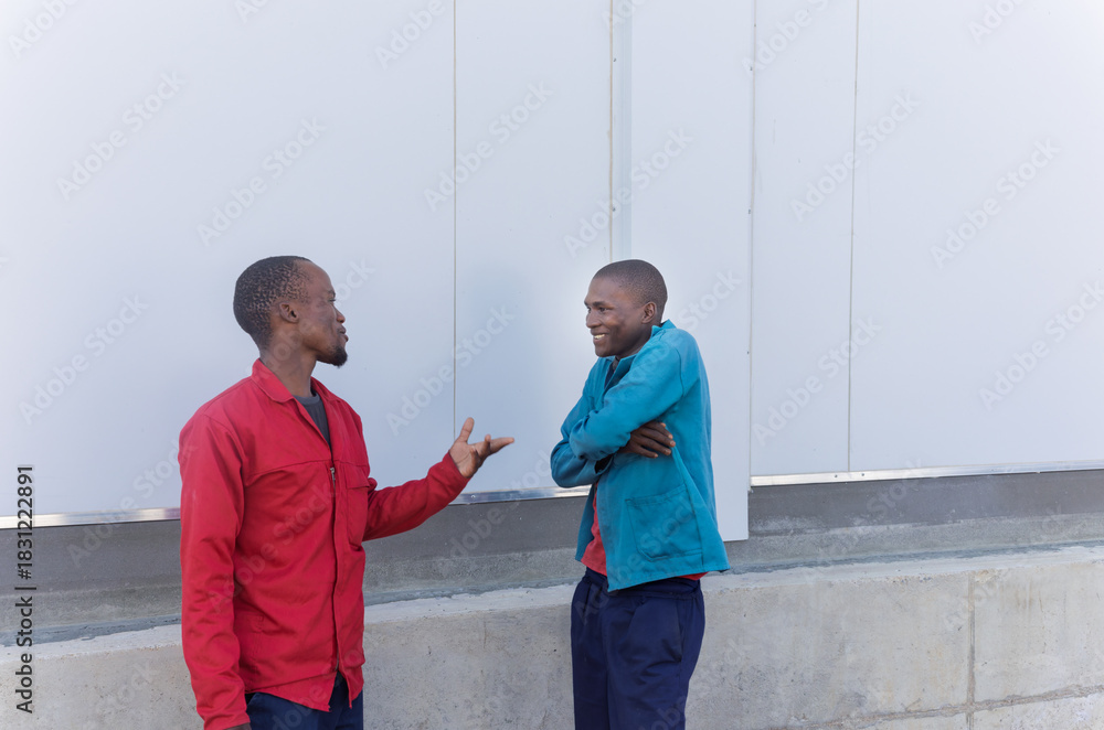 two african young workers, workwear uniform, chatting outdoors next to a warehouse wall
