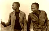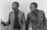 two african young workers, workwear uniform, having a talk, standing outdoors next to a warehouse wall, resting on the lunch break