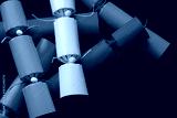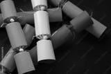 Brightly colored Christmas crackers piled onto a background of purple copy space