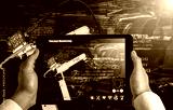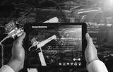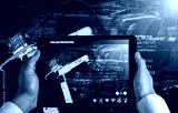 Engineer controls robotic arms by augmented reality industry technology application software. Smart robot machine in future factory working in concept of Industry 4.0 or 4th industrial revolution.