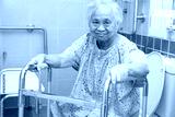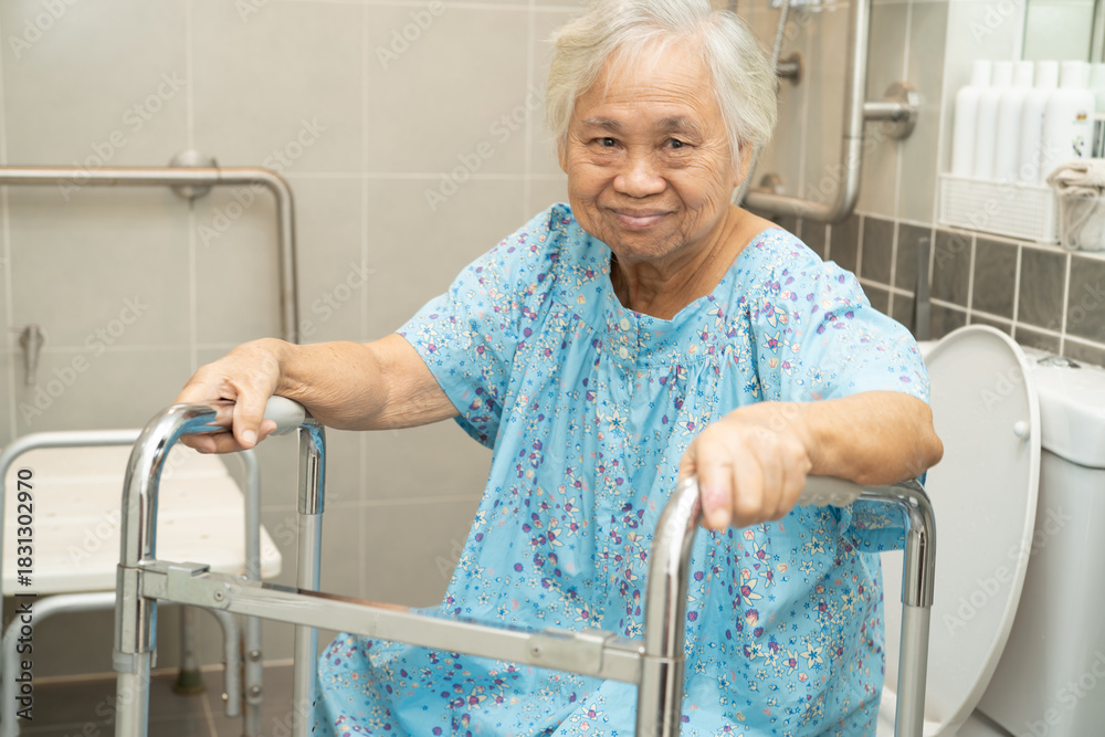Asian elderly woman patient use walker and toilet bathroom handle security in nursing hospital, healthy strong medical.