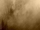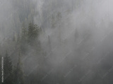 Misty fog swirling around conifer trees on Mount Rainier slopes, creating mystical woodland ambiance with soft, dreamlike mountain scenery