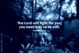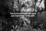 Bible verse quote - The Lord will fight for you, you need only be still. Exodus 14:14 on blur background of green nature forest with the hidden waterfall. Christianity faith concept. Religious words.