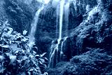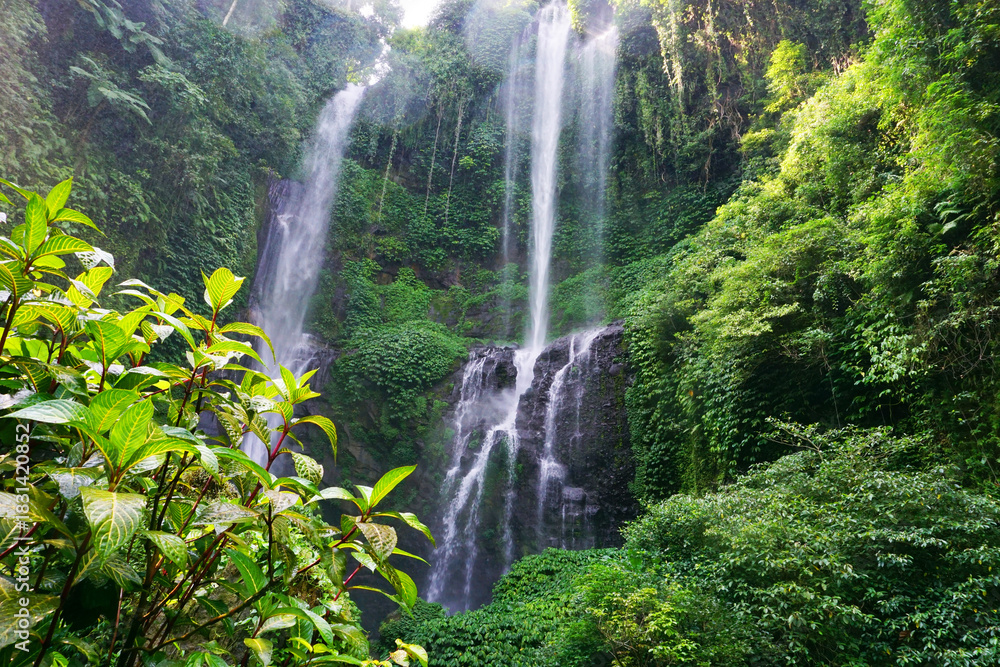 Hidden waterfall in the green nature forest. Waterfalls landscape background. Waterfalls surrounded by green trees