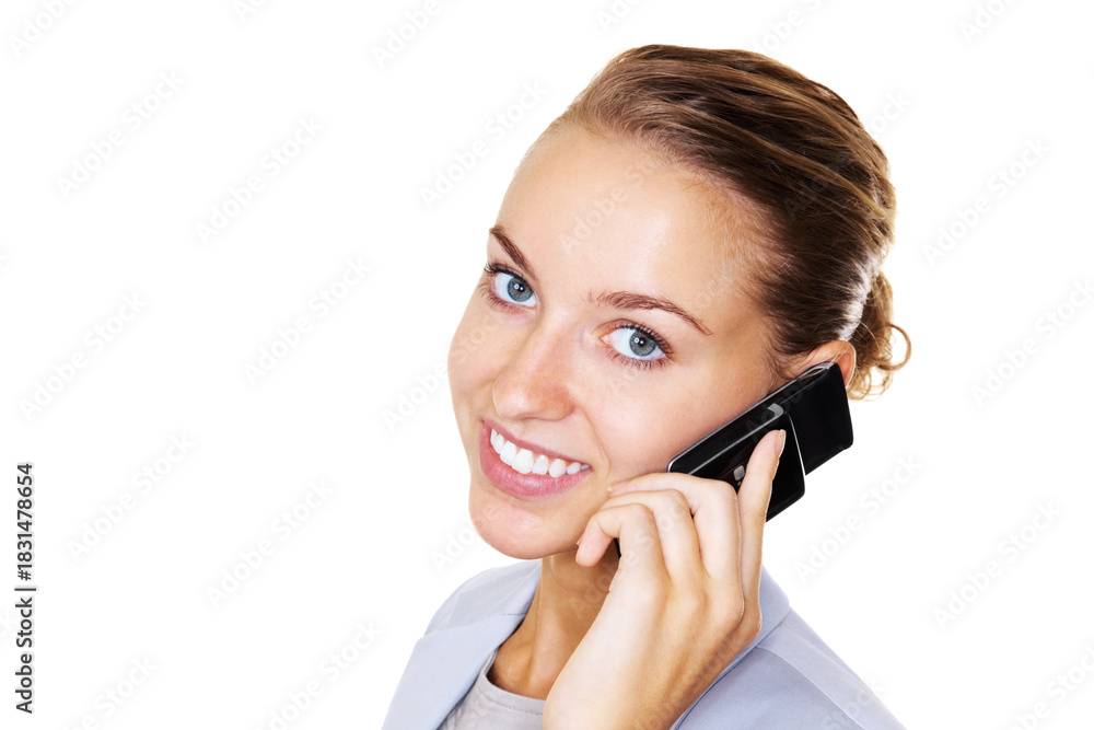 Smile, phone call and business woman in studio for investment offer, help or advice. Communication, portrait and wealth advisor with mobile for financial update, budget or space on white background