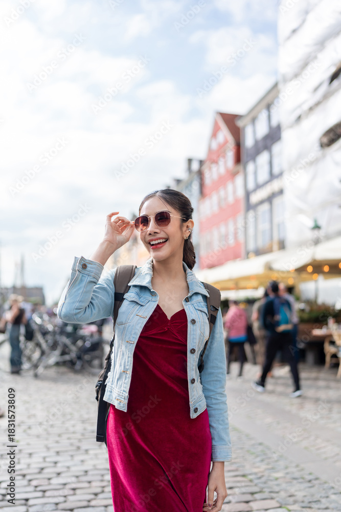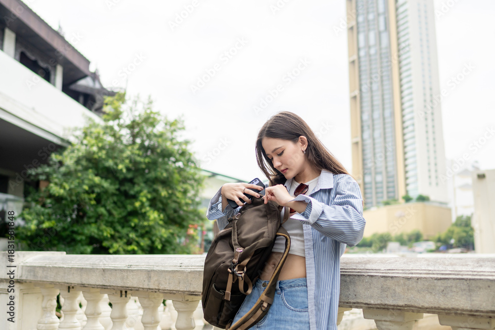 Asian young beautiful woman backpacker exploring the city outdoors.