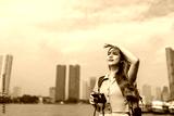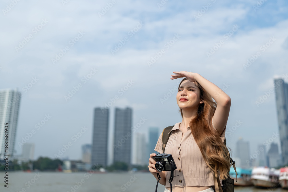 Asian young beautiful woman backpacker exploring the city outdoors.