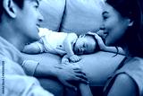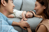 Asian parents looking at baby boy sleep on sofa in living room at home.