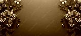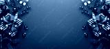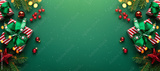 Merry Christmas and Happy Holidays greeting card, frame, border. New Year. Red Christmas ornaments and gifts, presents on green background top view. Xmas holiday festive theme. Christmas decoration