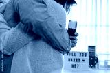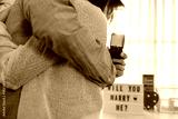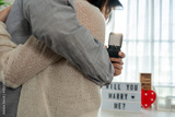 Close up of romantic man surprise girlfriend with a marriage proposal.