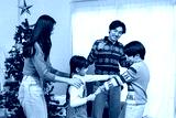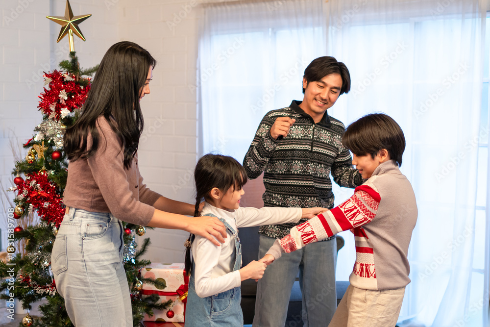 Lovely Asian family celebrating Christmas party together at cozy home.