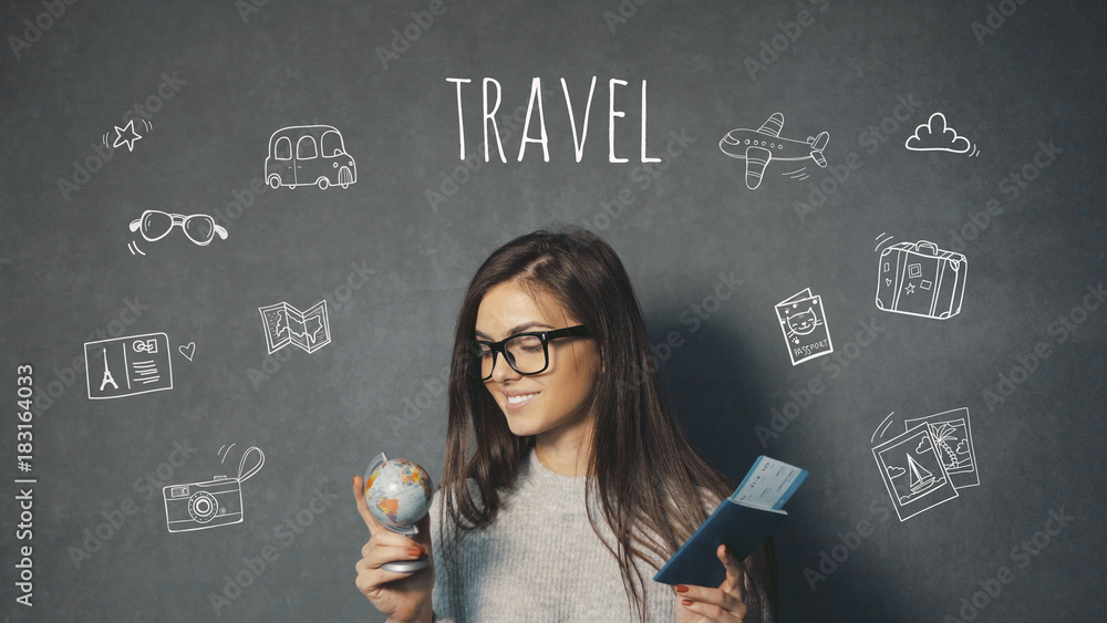 Beautiful long-haired girl taking a view of countries on the globe happily, isolated shot