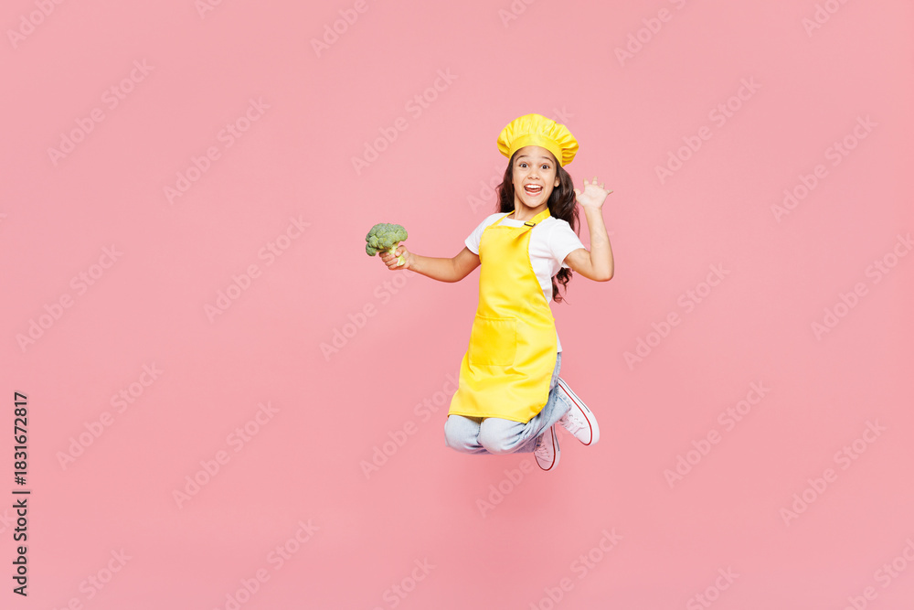 Full body side view small kid child girl housewife chef cook baker mother's helper wear yellow apron toque cap jump high hold in hand broccoli isolated on plain pink background. Cooking food concept.