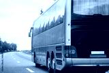 Large coach bus travels on asphalt road during sunset, warm sunlight reflects on vehicle side, trees line roadside, open sky on horizon, view of bus rear.