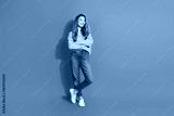 Young woman in yellow cardigan and jeans stands against blue backdrop smiling confident and relaxed
