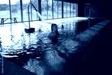 Woman relaxing under waterfall in indoor swimming pool
