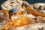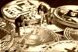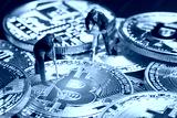 macro miner figurines working on group of bitcoins. virtual cryptocurrency mining concept