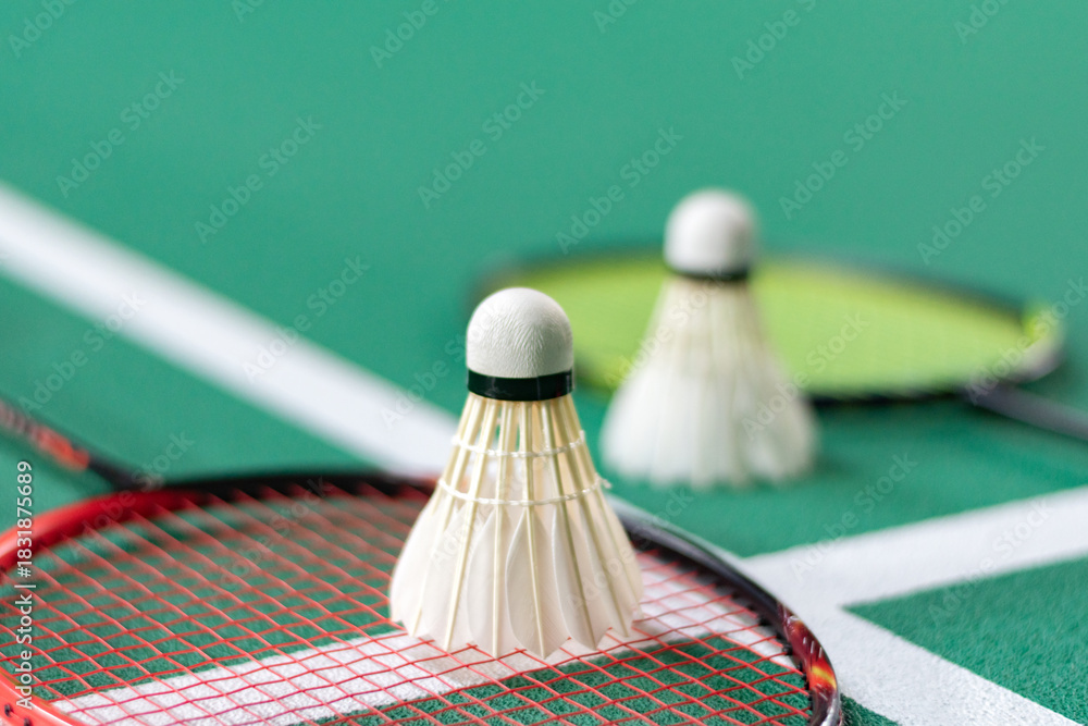 Cream white badminton shuttlecock and racket on floor in indoor badminton court, copy space, soft and selective focus on shuttlecocks.
