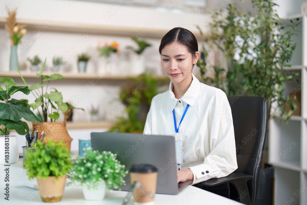 Focused woman working on laptop in stylish office
