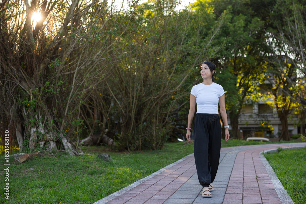 Young woman walking alone in beautiful park nature