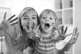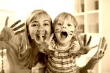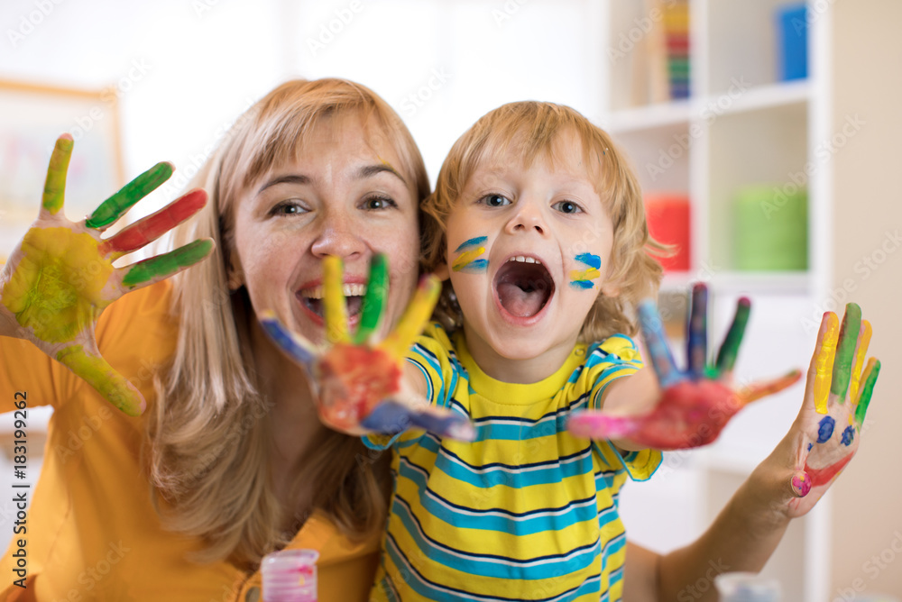 Smiling child boy and his mother having fun and showing hands painted in colorful paints