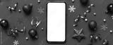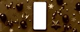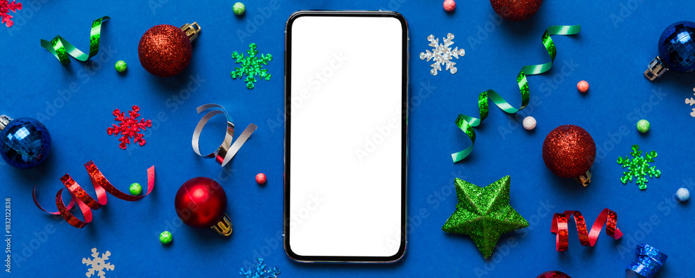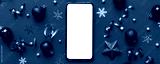 Christmas online shopping from home phone with blank white display top view. smart mobile with copy space on colored background with Christmas decorations balls,. Winter holidays sales background