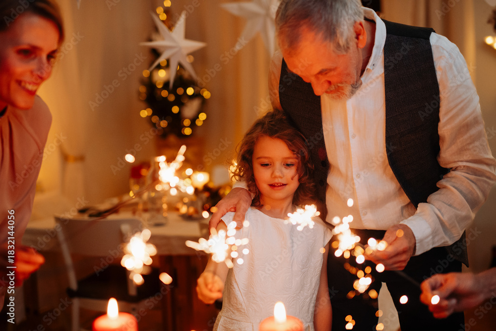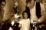 Grandparents and granddaughter holding sparklers during Christmas celebration.