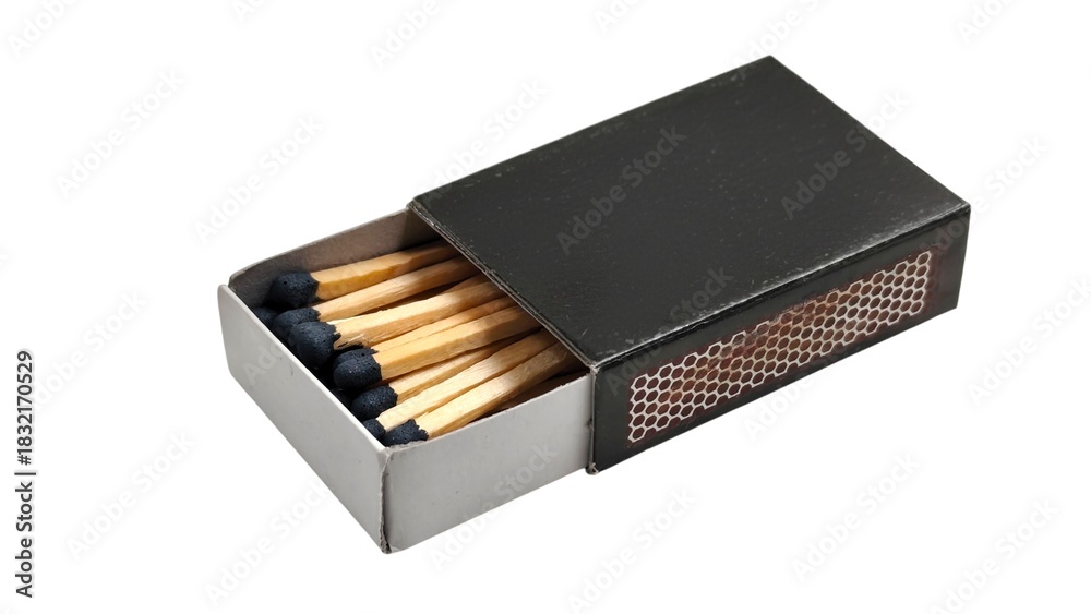 Photo of an open black matchbox revealing neatly arranged wooden safety matches with black match heads, isolated on white background.