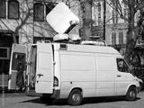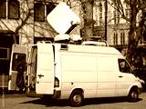 Outside broadcast mainstream white van media vehicle broadcasting for a television news channel in London England UK, global communication stock photo image