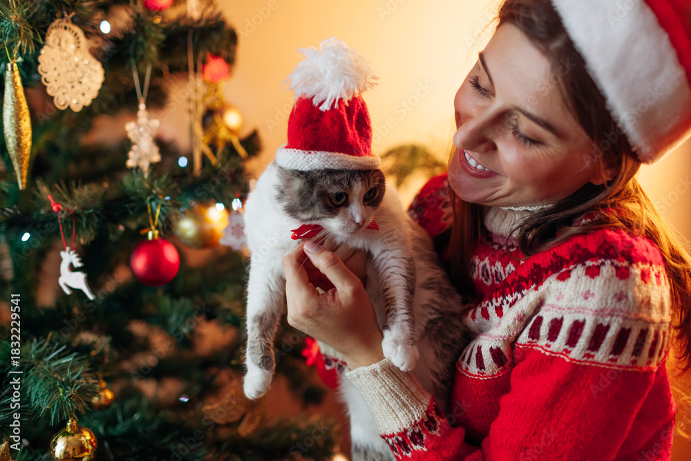 Celebrating Christmas with cat by New Year tree at home. Woman holding pet with Santa's hat on feeling festive