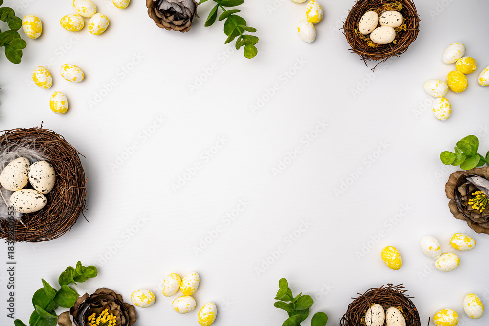 Happy Easter background with easter eggs in nest and spring flowers. Easter background with copy space. Flat lay. High quality photo
